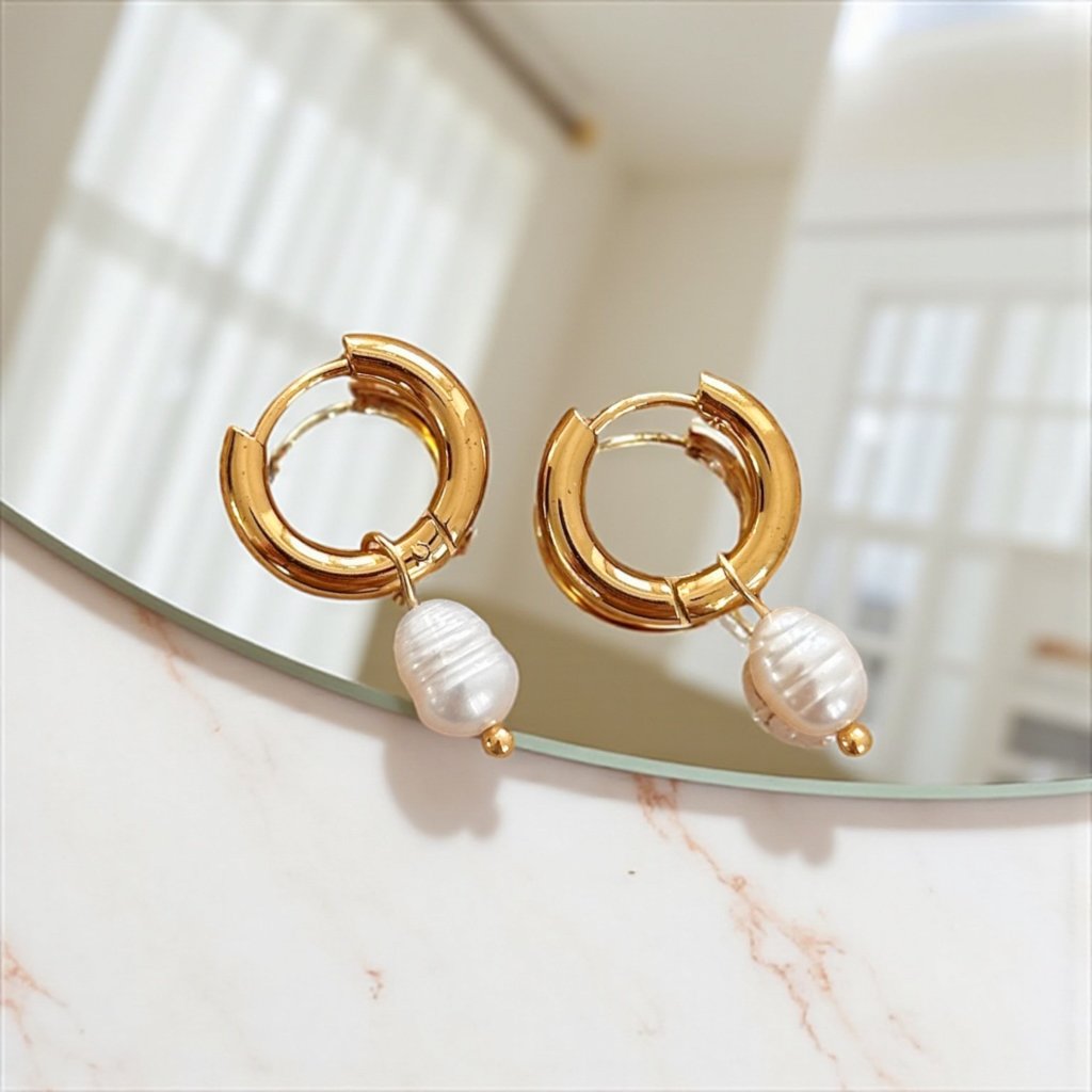 Best of the Best vol.2 – Luxusní ručně vyráběné náušnice z pozlacené nerezové oceli s nádhernou pravou říční perlou. Elegantní design s kroužkem o průměru 1,6 cm a výraznější tloušťkou 3 mm podtrhuje ženskost a sofistikovanost. Celková délka 2,8 cm zajišťuje dokonalou rovnováhu mezi minimalismem a luxusem.