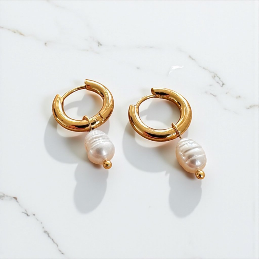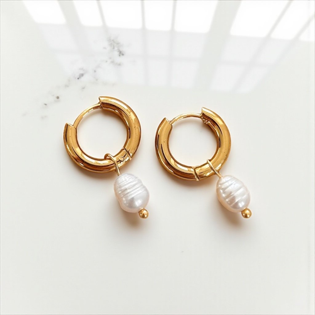 Luxusní náušnice Best of the Best z nerezové oceli ve zlaté barvě s pravou říční perlou. Délka 2,8 cm, průměr kroužku 1,6 cm, tloušťka 3 mm. Ruční výroba z Liberce, exkluzivní elegance s dotekem exotiky.