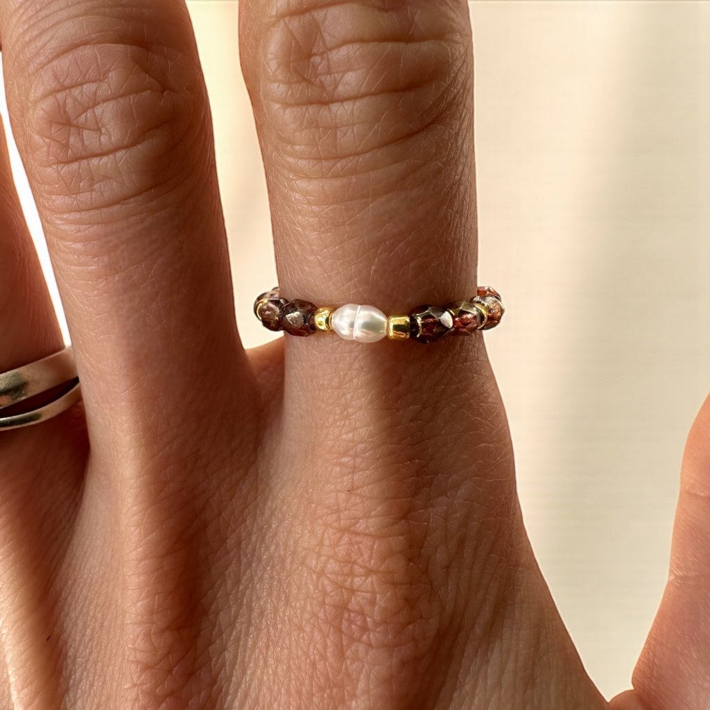 Prstýnek je vyroben z pravé říční perly velikosti cca 4 mm (v jemné bílé barvě), z jabloneckého skla a doplněný japonskými korálky TOHO ve zlaté barvě.