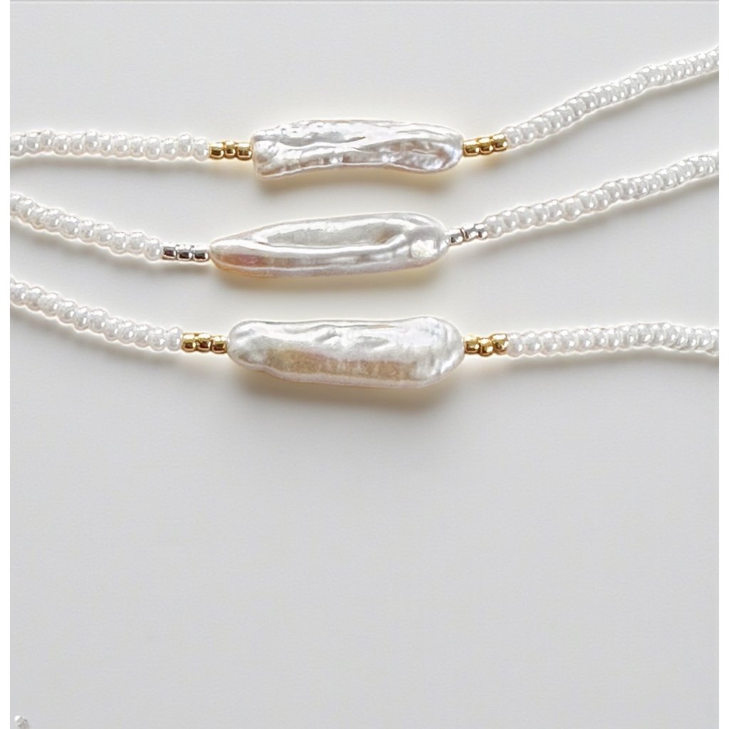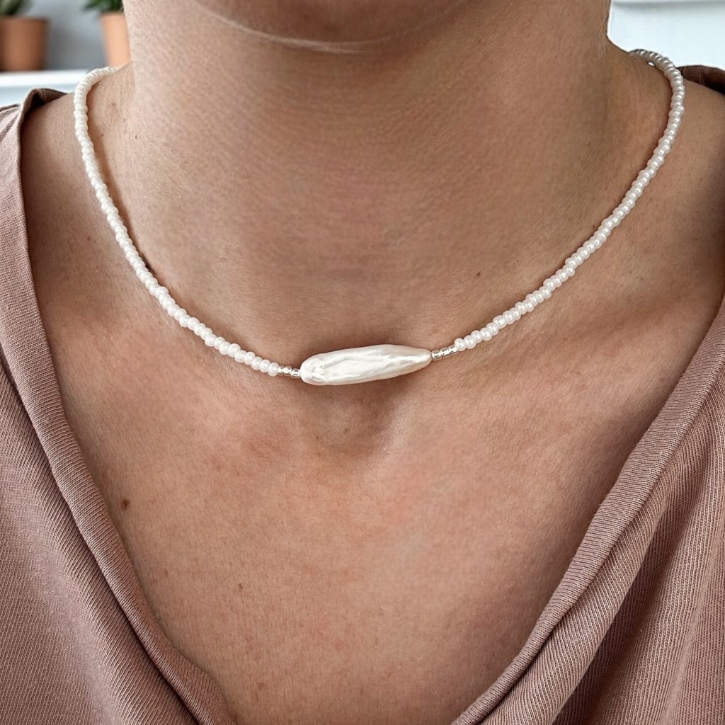 Náhrdelník je vyroben z pravé říční perly o délce cca 2,5 cm (v jemné bílé barvě), z jabloneckého rokailu a doplněný japonskými korálky ve stříbrné barvě.