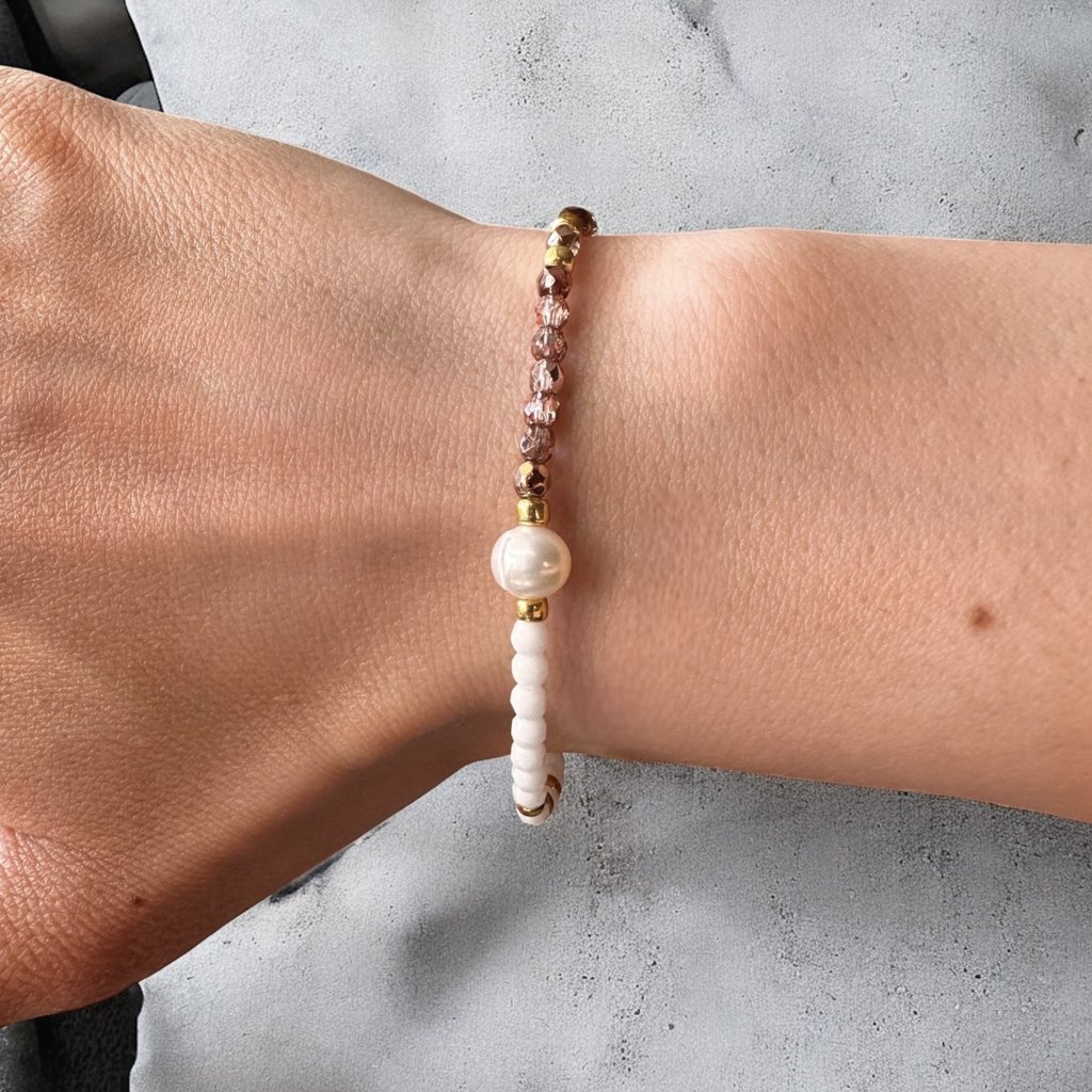 Náramek Eternity je jedním z nejoblíbenějších a nejprodávanějších šperků v naší nabídce. Spojuje pravé říční perly, fasetované korálky z Jablonce nad Nisou a japonské korálky TOHO, což vytváří elegantní a nadčasový design. Jeho unikátní kombinace bílých a bronzových prvků osloví ženy, které preferují minimalistické šperky s osobitým stylem. Náramek je dostupný s chirurgickým zapínáním nebo na gumičce.