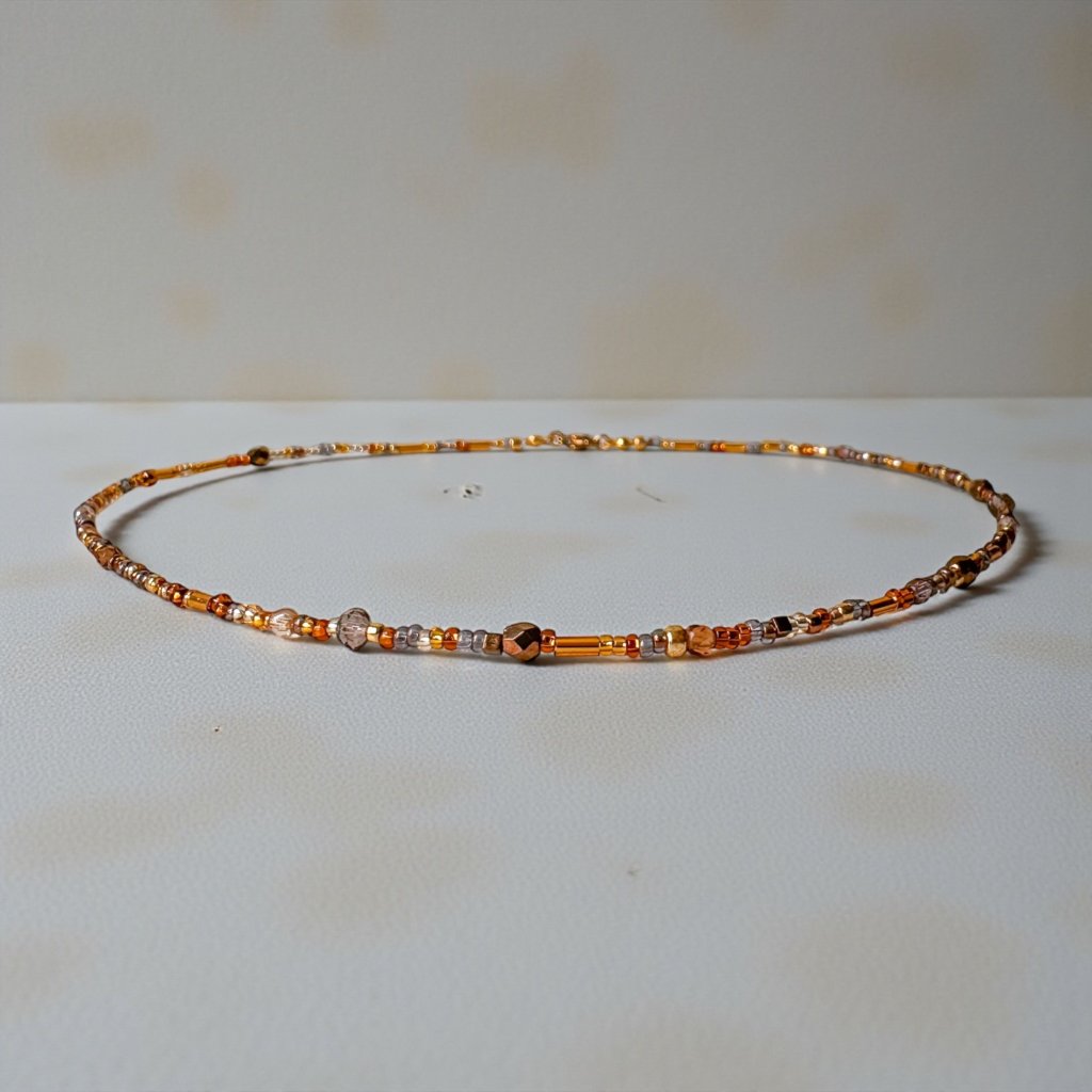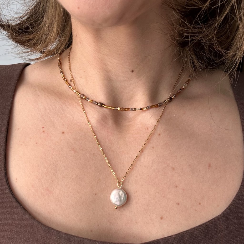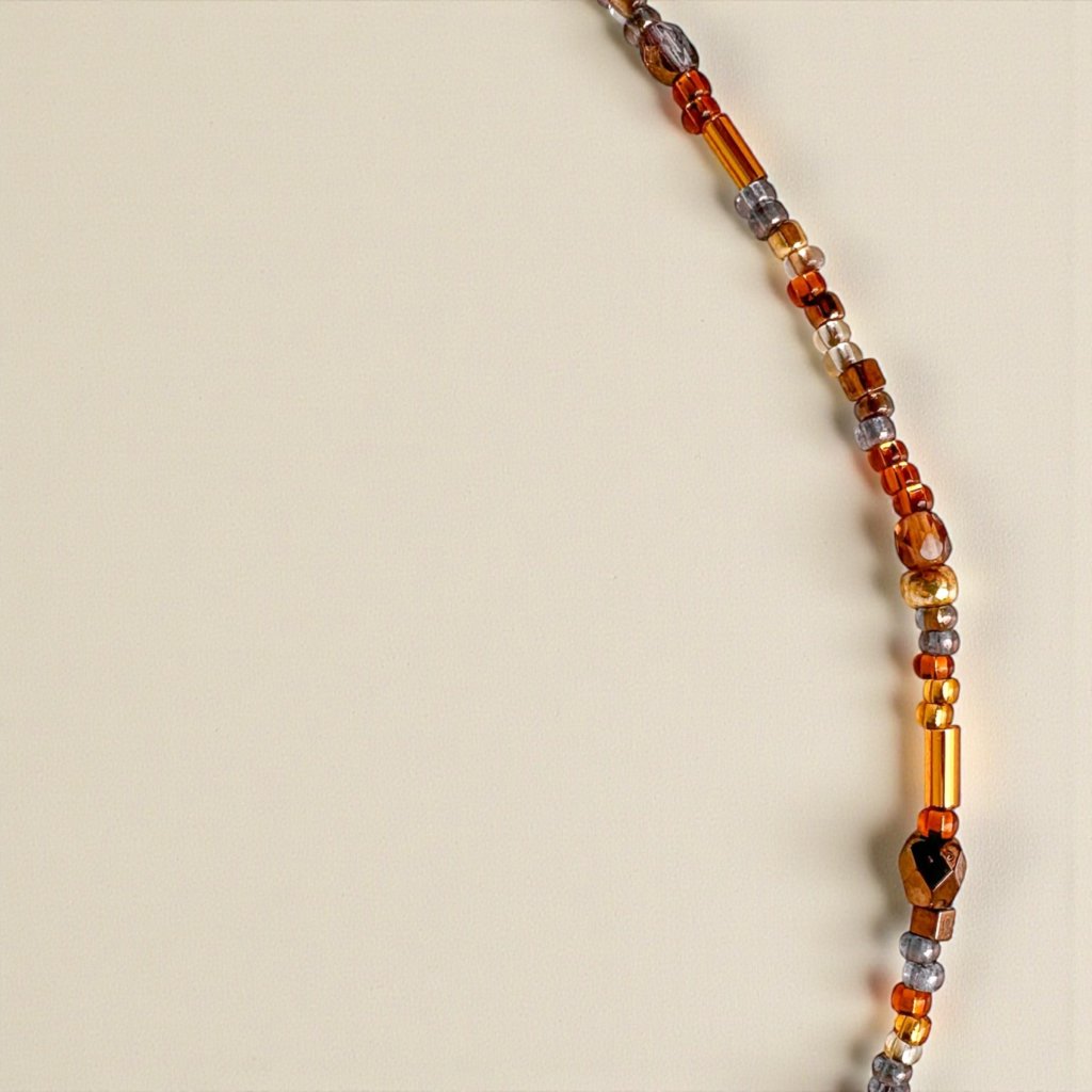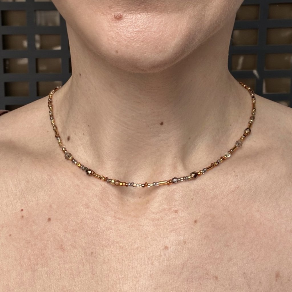 Náhrdelník je laděný do zlato-hnědých tónů a najdeme na něm tradiční české skleněné korálky společně s japonskými korálky, které jsou po celém světě známé svou kvalitou a perfektním tvarem. Zapínání z pozlacené nerezové oceli.