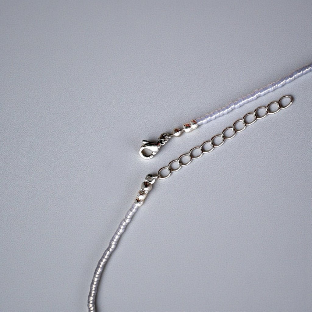 Navlečeno na vlasci, zapínání je na karabinku z nerezové oceli s prodlužovacím řetízkem v délce 5 cm.