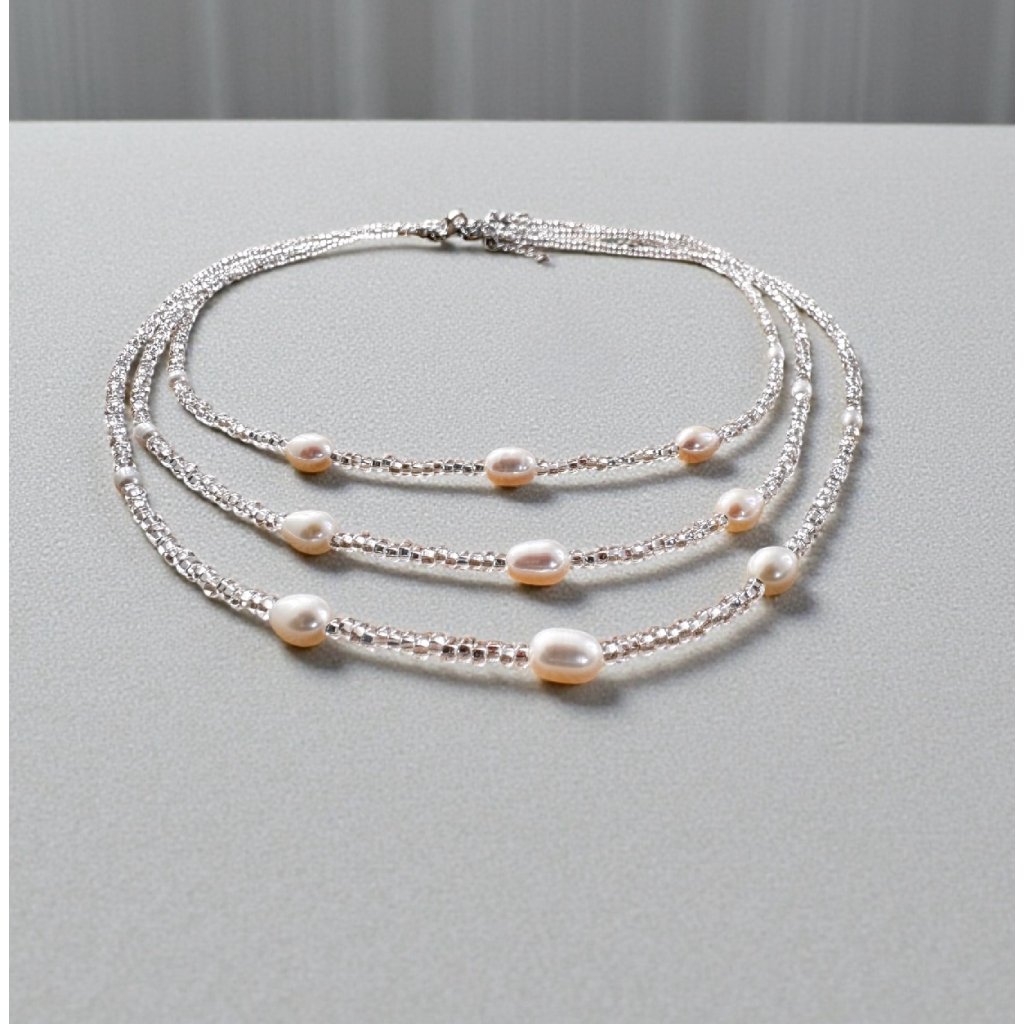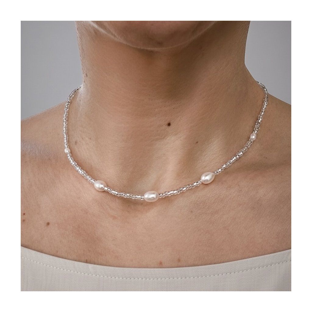 Je vyroben z pravých říčních perel a z jabloneckých rokajlových korálků. Ručně vyrobeno v Česku z pečlivě vybraných tradičních materiálů z domova i ze světa. Ideální pro výjimečné příležitosti, při kterých chcete zazářit.