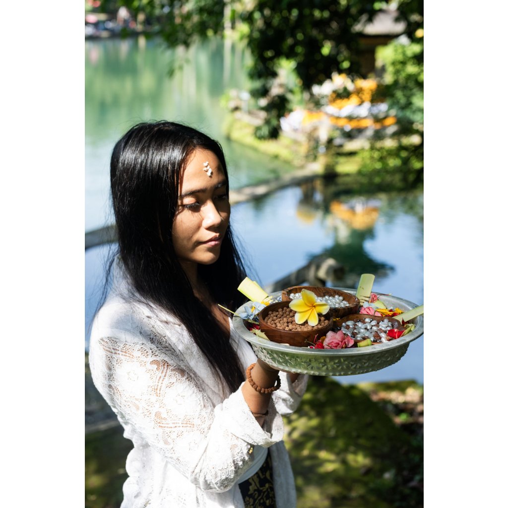 Kolekce Bali Blessed vznikla z hluboké úcty k tradici, přírodě a tichému kouzlu okamžiku. Každý šperk z této kolekce v sobě nese materiál, který byl osobně požehnán balijským knězem během svátku Kuningan – v posvátném chrámovém areálu Taman Mumbul Sangeh, kde se svět hmotný a duchovní potkává v dokonalé rovnováze.