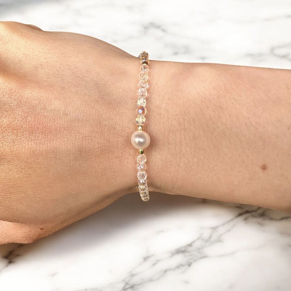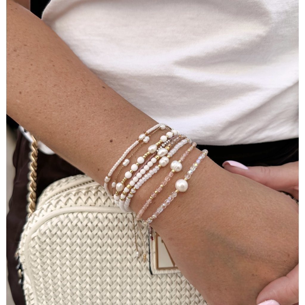 Pravá říční perla (5-6 mm) posvěcená při slavnostním obřadu na Bali. Navlečeno na pružné gumičce. Skleněné korálky z Japonska (TOHO). Broušené skleněné korálky z Jablonce nad Nisou.