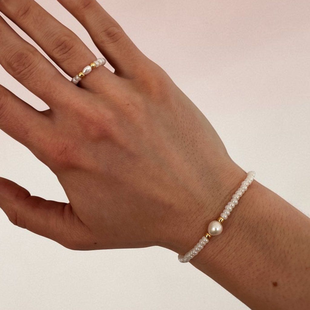 Jemný náramek s pravou říční perlou, skleněnými korálky z Jablonce nad Nisou a luxusními japonskými korálky.