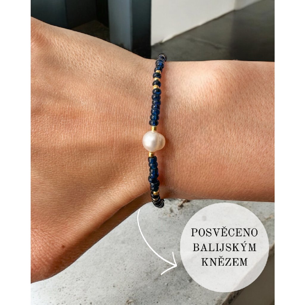 Pravá říční perla (5-6 mm) posvěcená při slavnostním obřadu na Bali. Modré korálky pocházejí z Jablonce nad Nisou a zlaté korálky pochází z Japonska (TOHO).