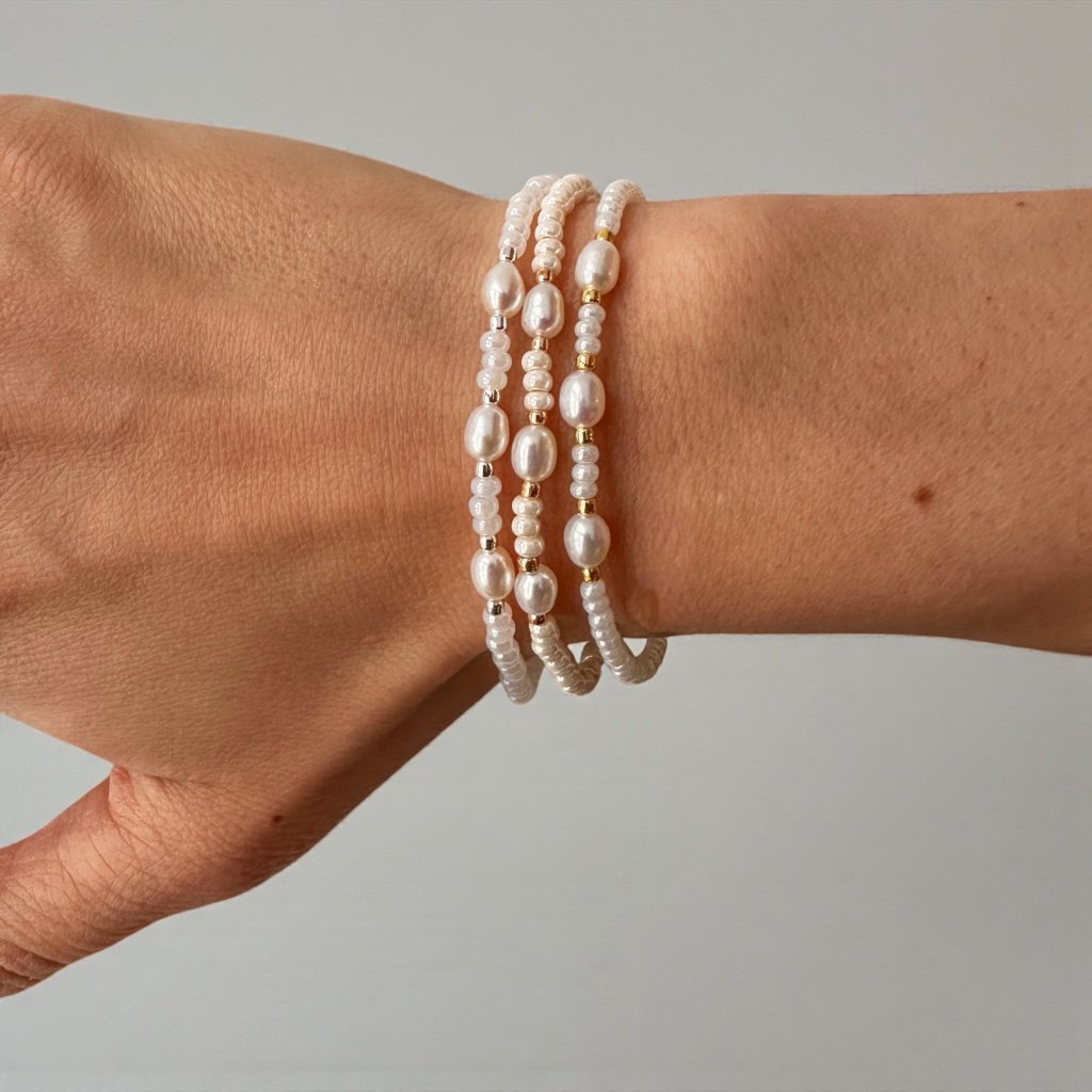 Jemný a elegantní náramek s pravými říčními perlami, skleněnými korálky z Jablonce nad Nisou a luxusními japonskými korálky. Dokonalá harmonie přírodní krásy a jemného třpytu. Ideální pro romantické duše i milovnice nadčasové elegance. Ruční práce, originální design.