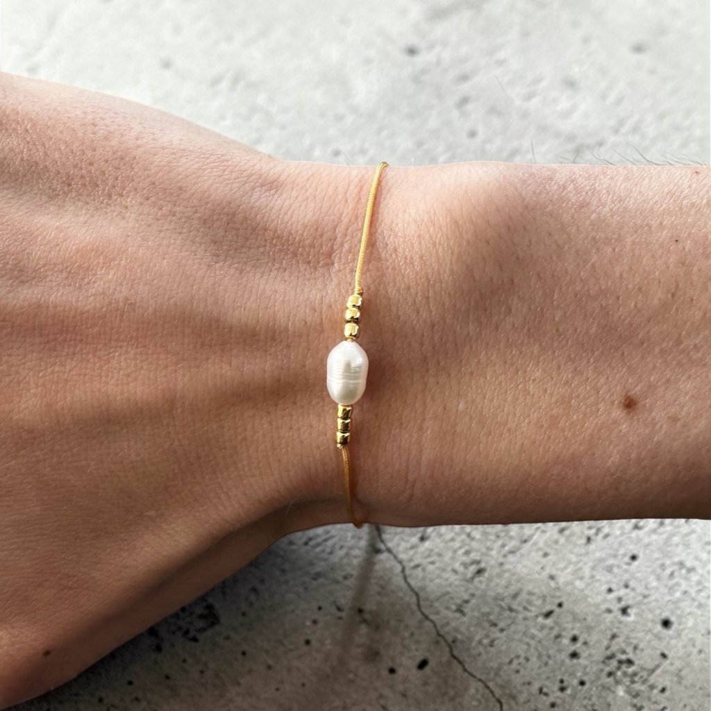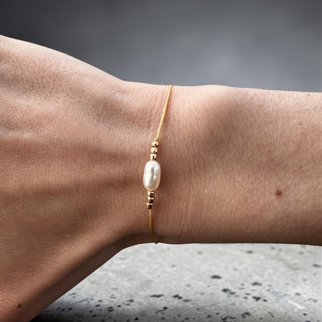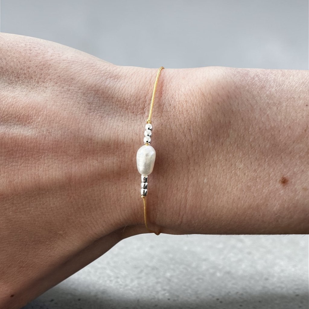 Náramek je doplněn o korálky v jemné zlaté, stříbrné nebo rose gold barvě, což dodává šperku nádech elegance a moderního minimalistického stylu. Doplňující textilní šňůrka v barvě zlatožluto-béžová je velmi pohodlná a ideálně ladí s celkovým designem náramku.
