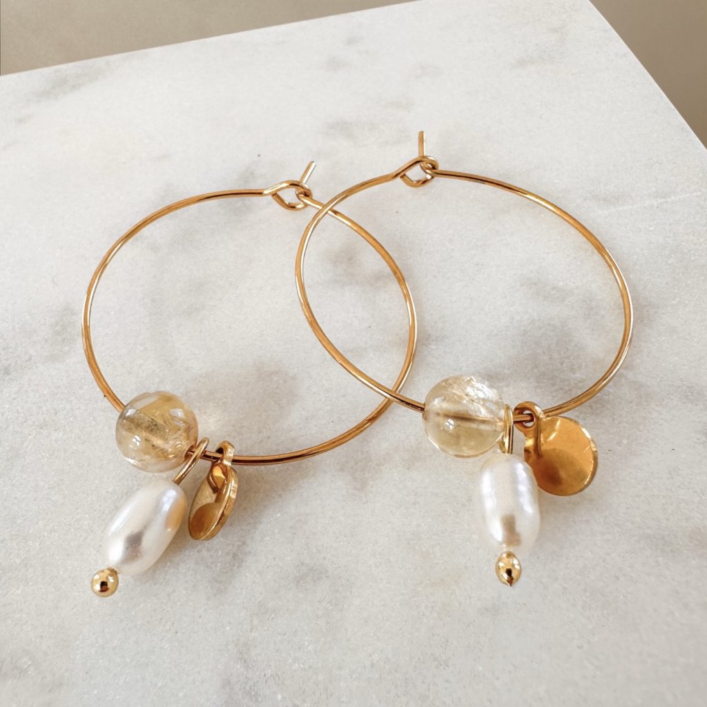 Citrine & Shimmer – Luxusní ručně vyráběné náušnice z pozlacené nerezové oceli s nádhernou pravou říční perlou a s citrínem. Elegantní design s kroužkem o průměru 3 cm ve Vás probudí vzpomínky na letní dovolenou a na západy slunce plné zlatavé záře.