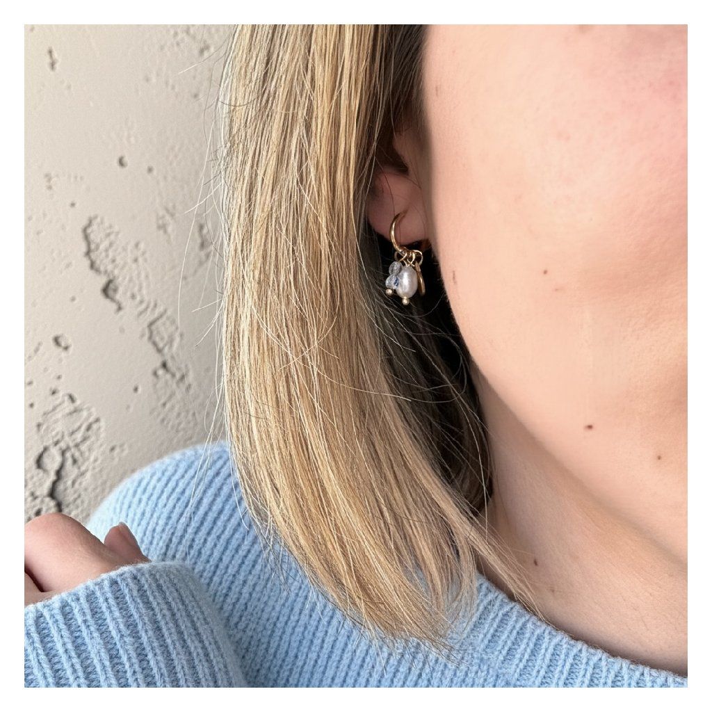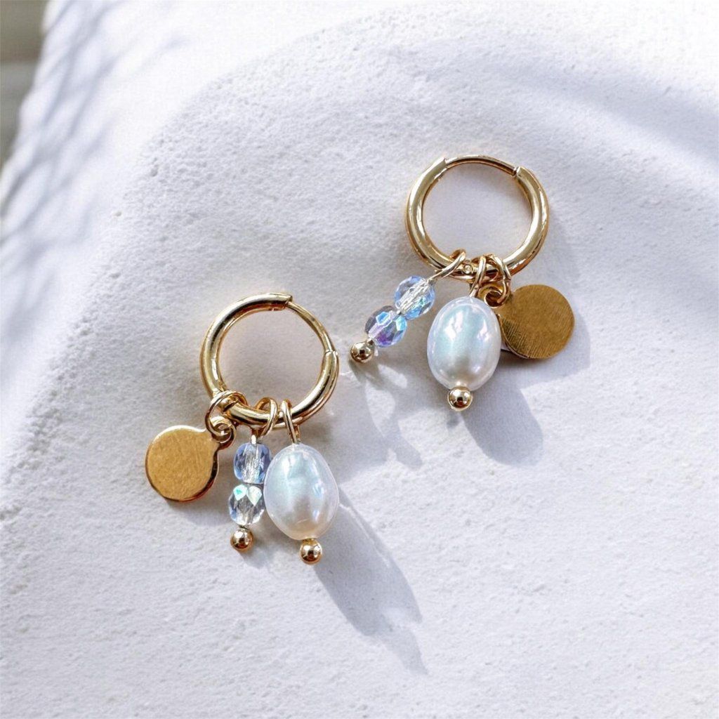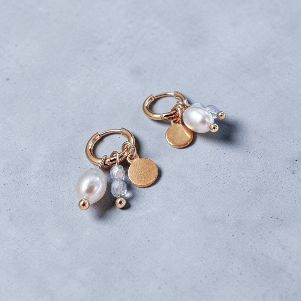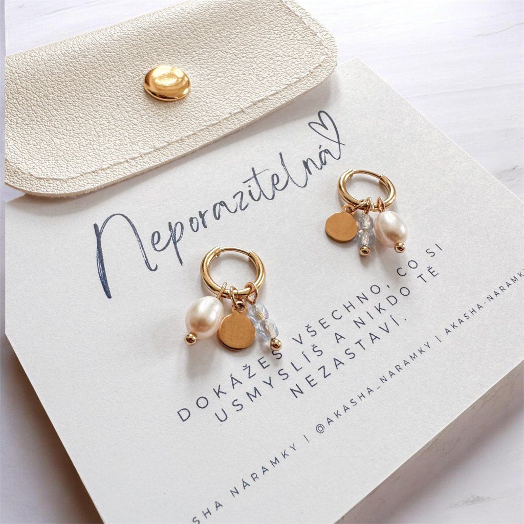 Náušnice jsou vyrobené z pozlacené nerezové oceli, pravých říčních perel a tradičních českých korálků.