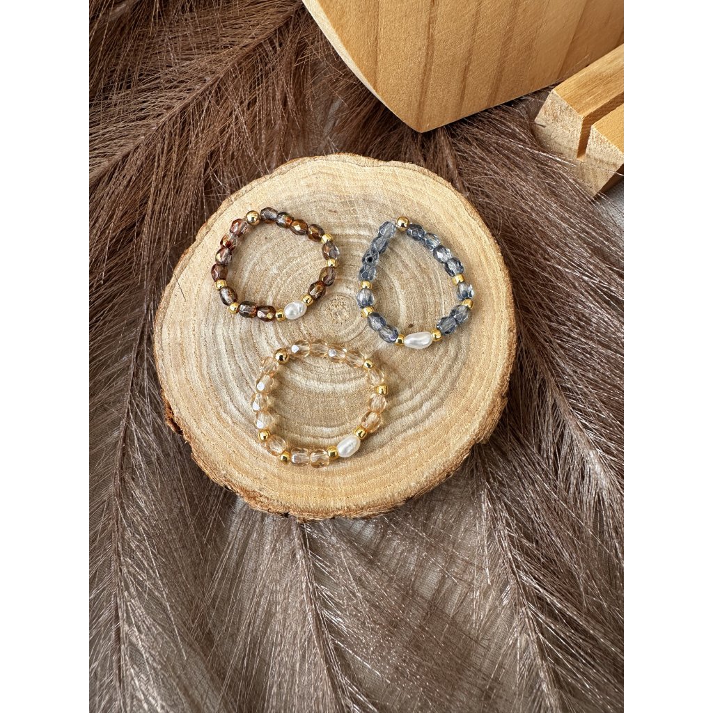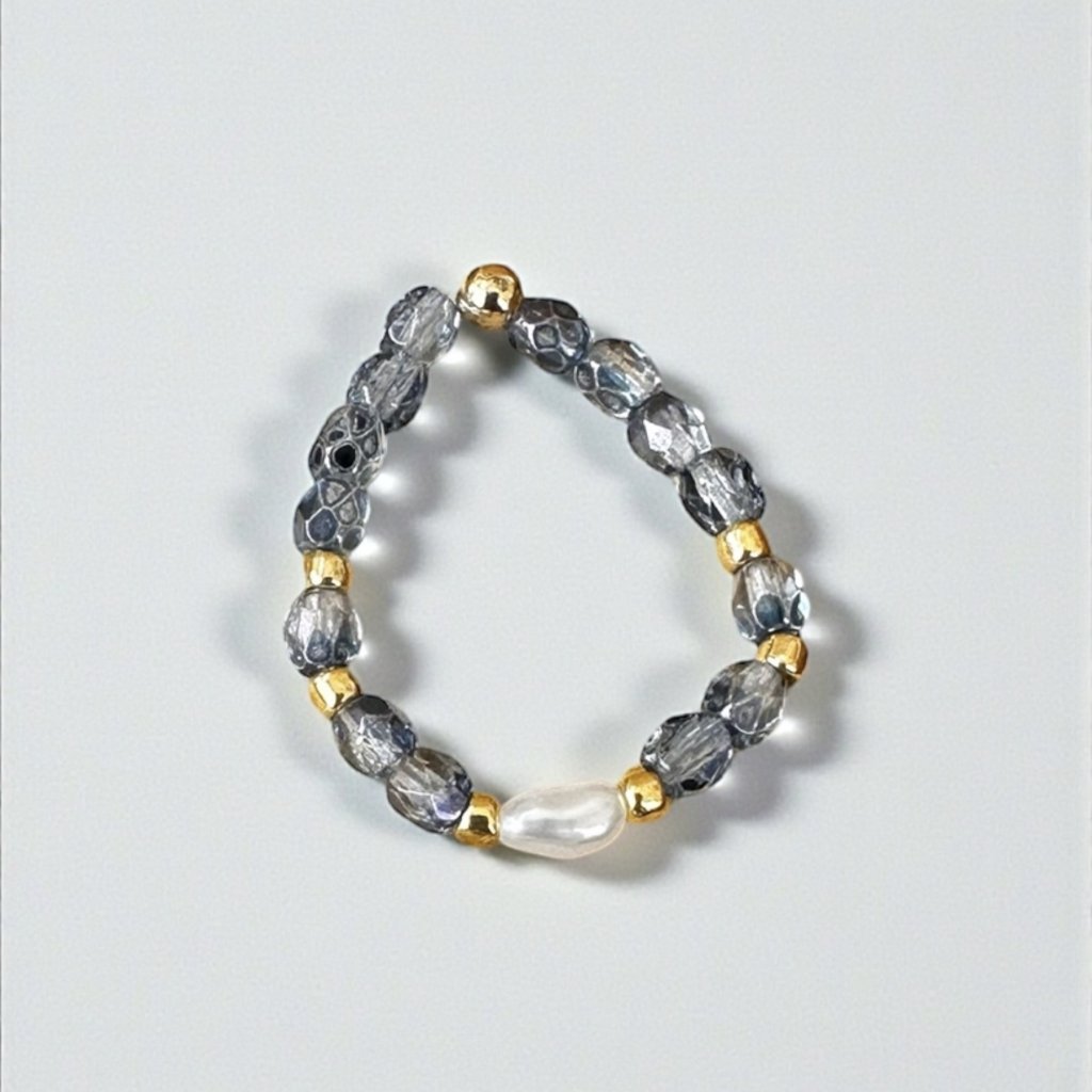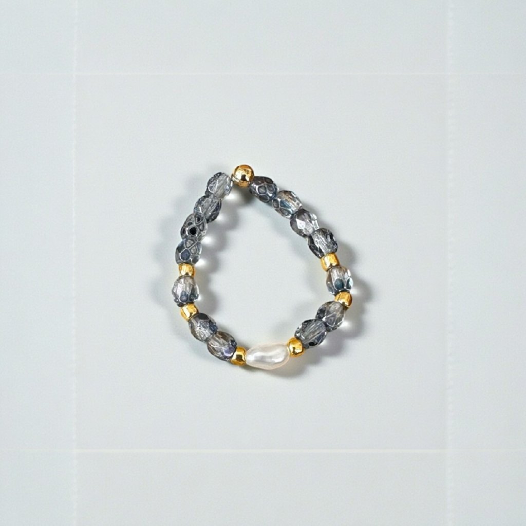 Prstýnek je vyroben z pravé říční perly velikosti cca 4 mm (v jemné bílé barvě), z jabloneckého skla a doplněný japonskými korálky TOHO ve zlaté barvě.