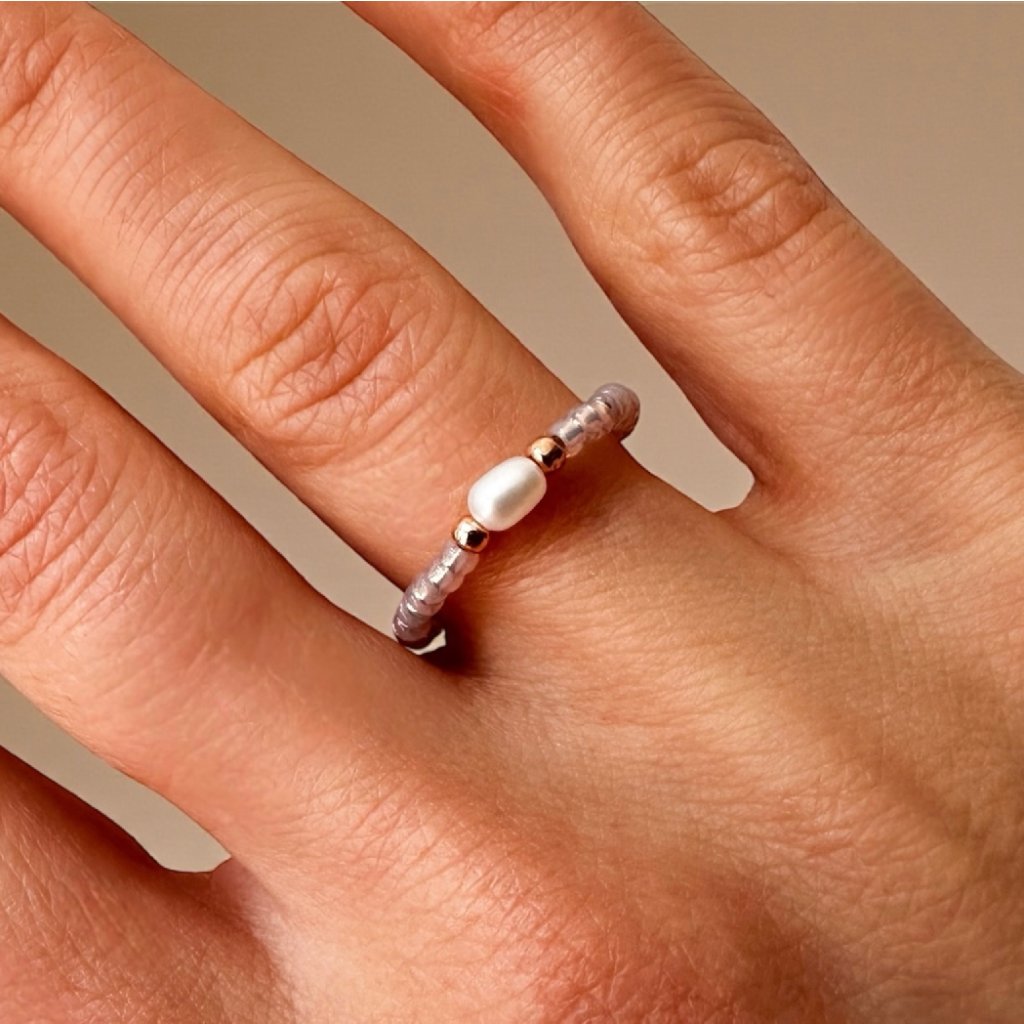 Prstýnek je vyroben z pravé říční perly velikosti 4 mm (v jemné bílé barvě), z japonského rokailu a doplněný japonskými korálky TOHO v rose gold barvě.