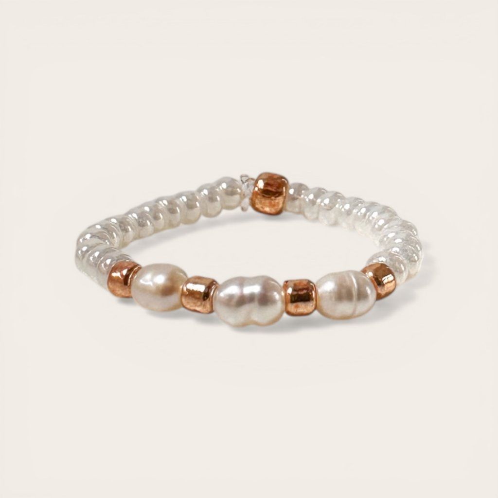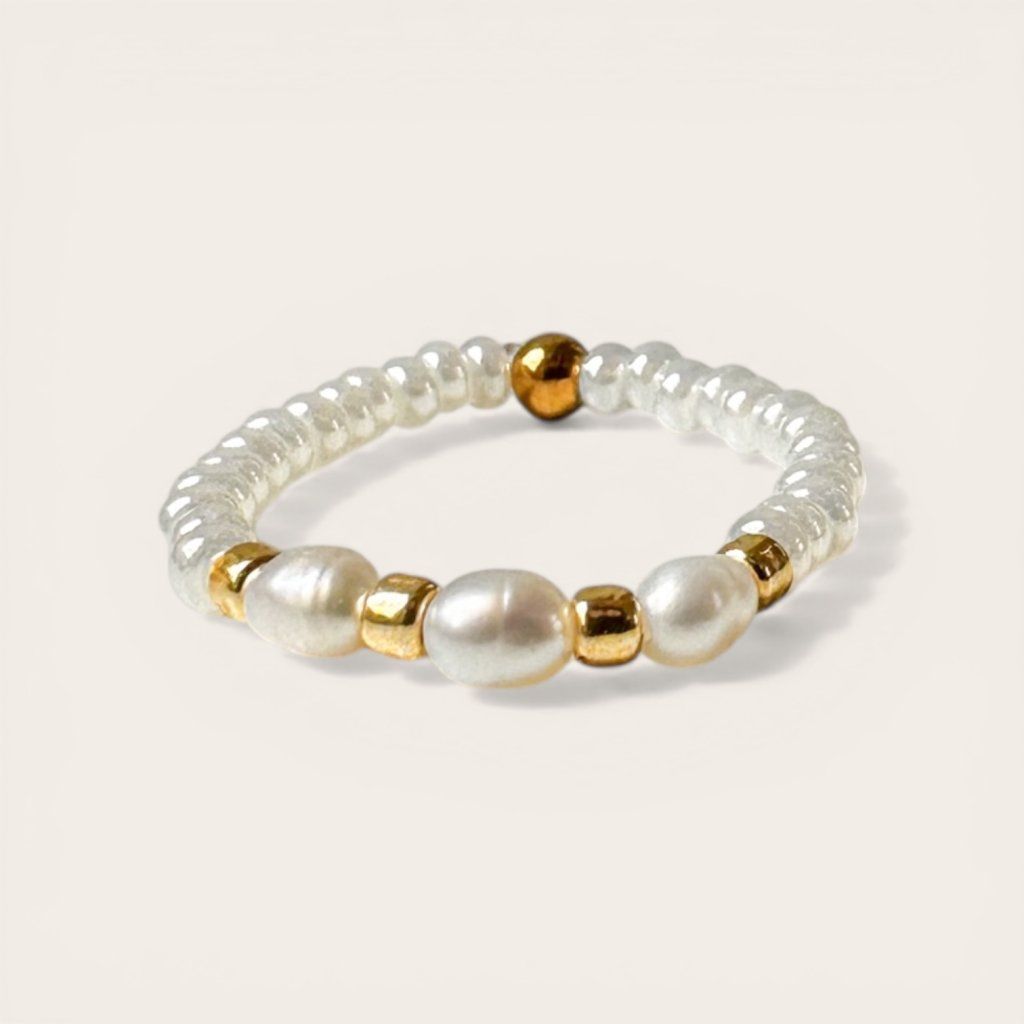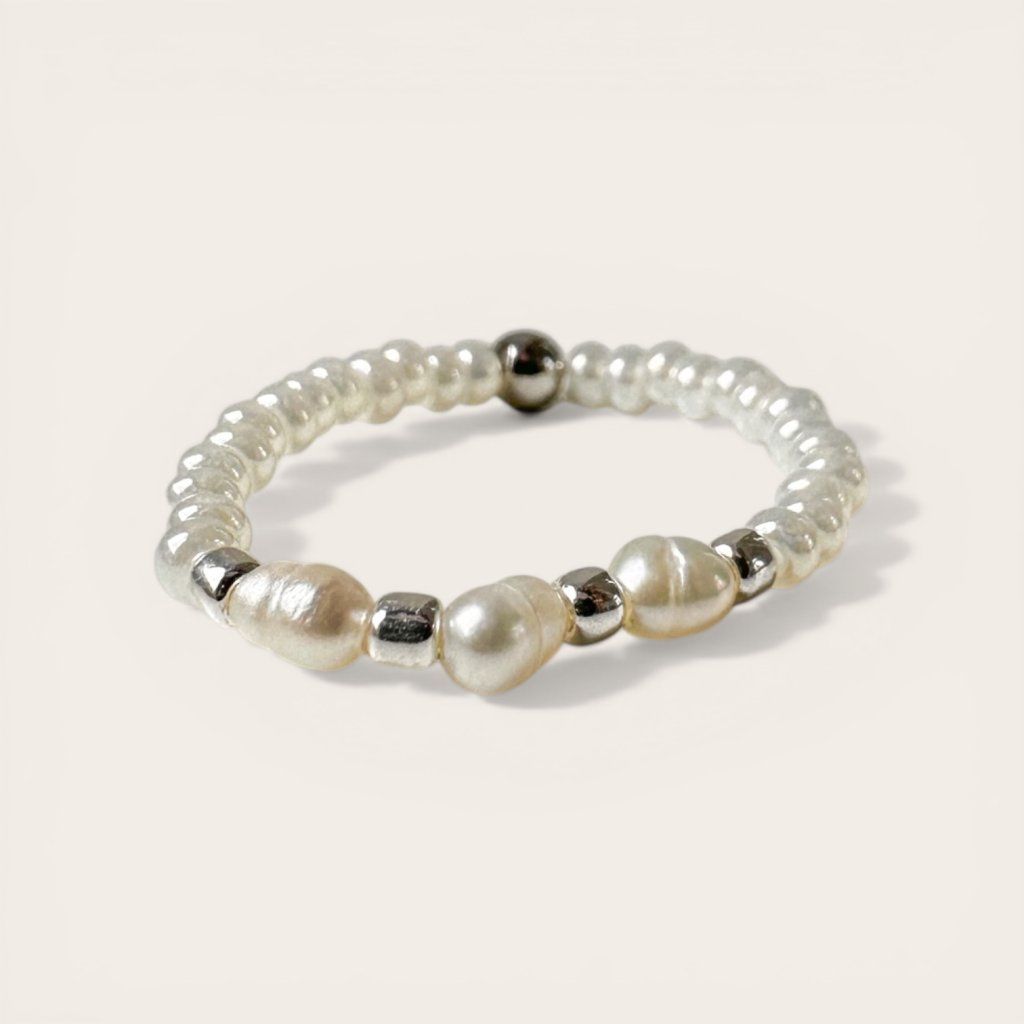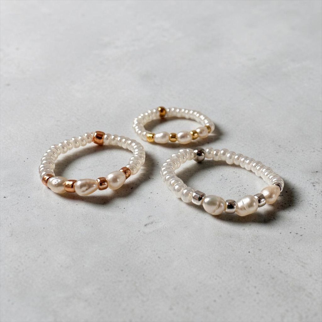 Prstýnek je vyroben z pravé říční perly velikosti cca 3-4 mm (v jemné bílé barvě) a z tradičních jabloneckých a japonských korálků.