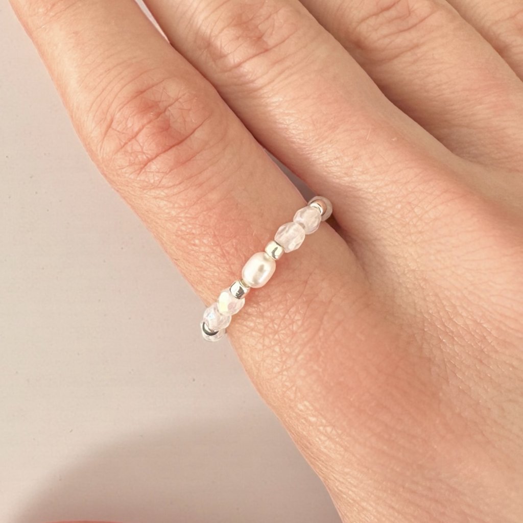 Jemný, elegantní náramek a prstýnek s pravými říčními perlami, skleněnými korálky z Jablonce nad Nisou a luxusními postříbřenými TOHO korálky.