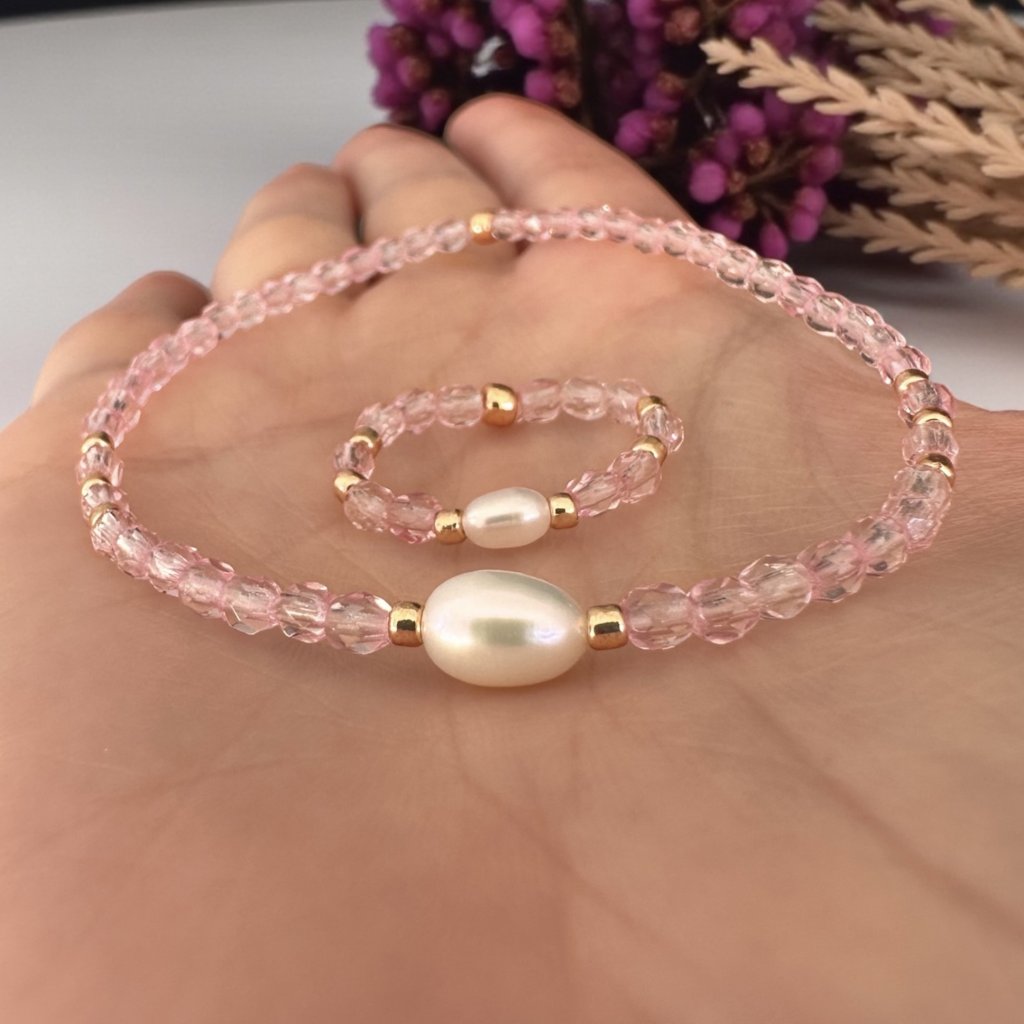 Jemný náramek a prstýnek s pravými říčními perlami, skleněnými korálky z Jablonce nad Nisou a luxusními TOHO korálky ve zlaté barvě.