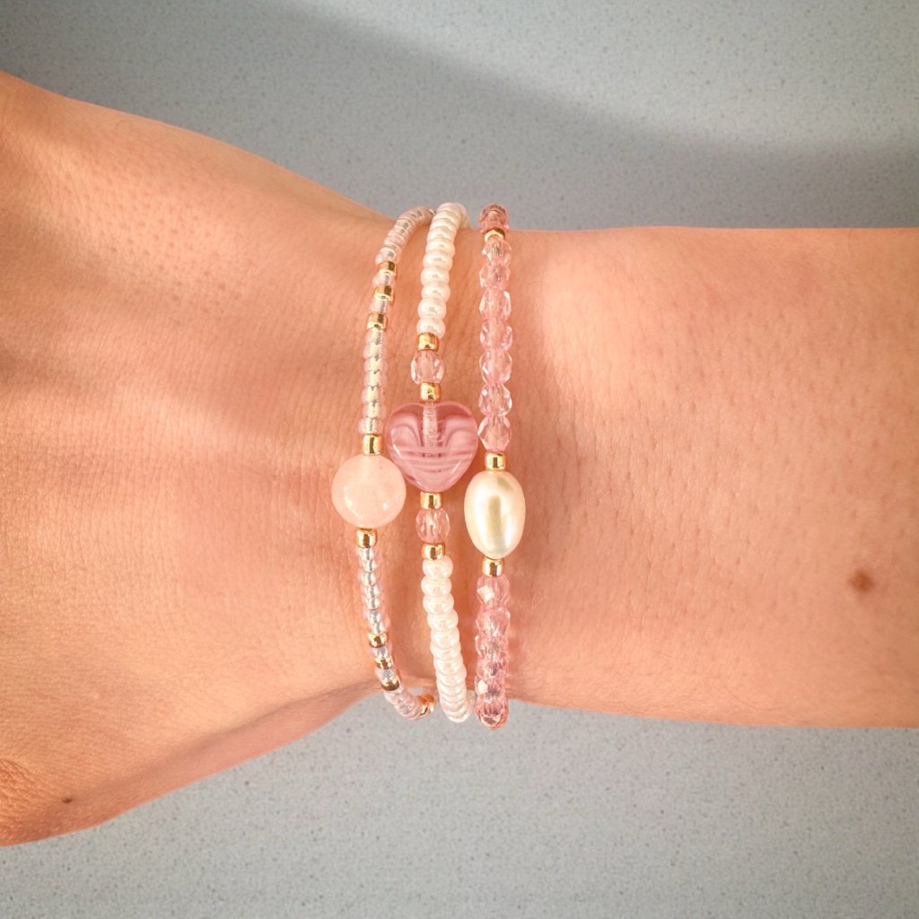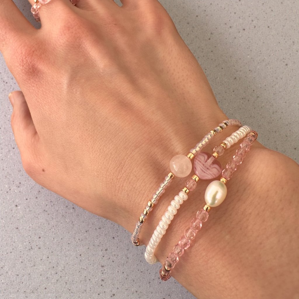 Jemný a elegantní náramkový set s pravou říční perlou, s růženínem a s motivem srdce, skleněnými korálky z Jablonce nad Nisou a luxusními TOHO korálky. Dokonalá harmonie krásy a jemného třpytu. Ideální pro romantické duše i milovnice nadčasové elegance. Ruční práce, originální design.