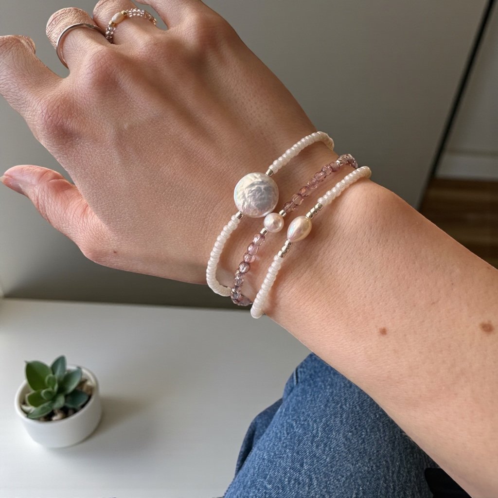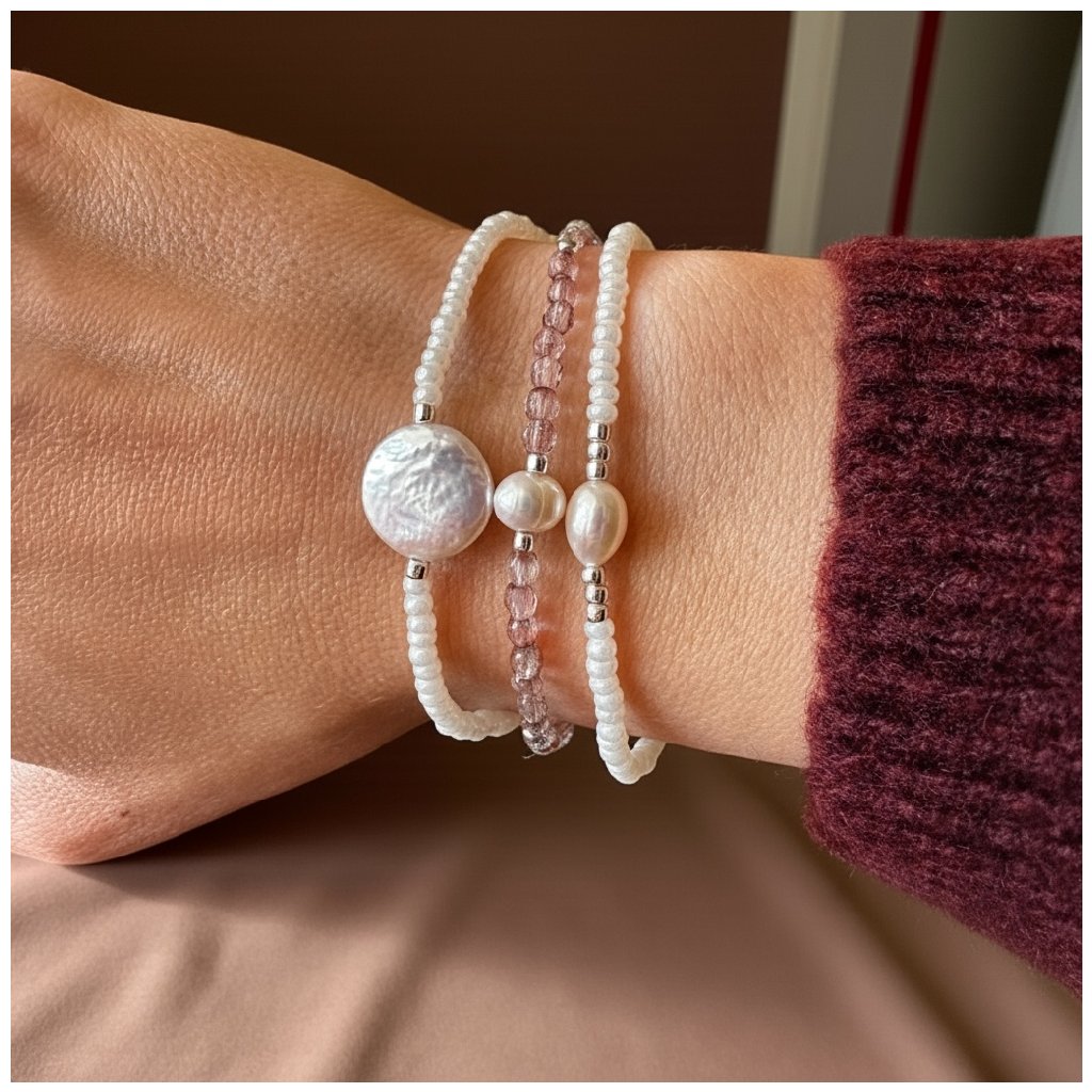 Japonské korálky té nejvyšší kvality společně s tradičními českými korálky se starají o nádherný jemný vzhled náramků.