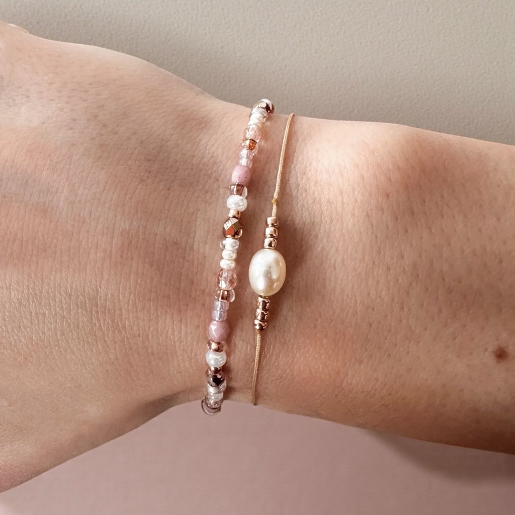Jemný a elegantní náramkový set s pravou říční perlou, skleněnými korálky z Jablonce nad Nisou a luxusními TOHO korálky v barvě rose gold. Dokonalá harmonie krásy a jemného třpytu. Ideální pro milovnice nadčasové elegance a jemné nepravidelnosti. Ruční práce, originální design.