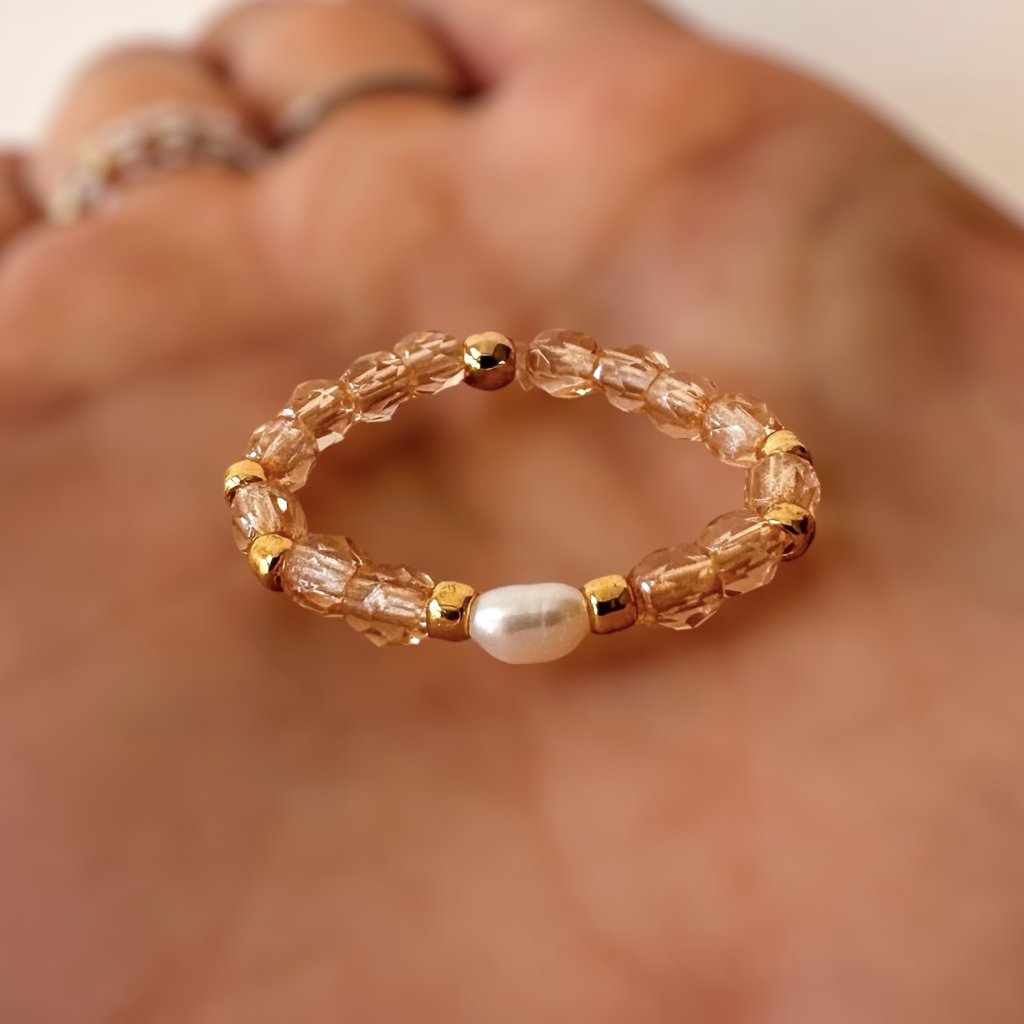 Prstýnek je vyroben z pravé říční perly velikosti cca 4 mm (v jemné bílé barvě), z jabloneckého skla a doplněný japonskými korálky TOHO ve zlaté barvě.